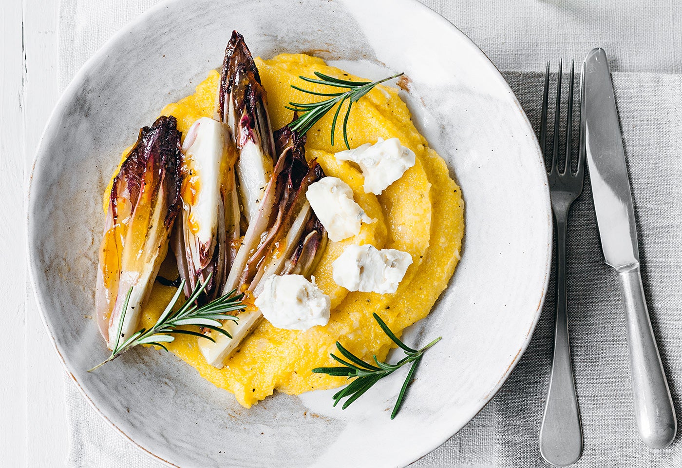 Cremige Polenta mit rotem Chicorée, Orangenmarmelade und Dolcelatte