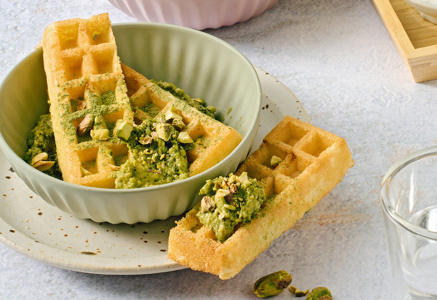 Matcha-Pistaziencreme mit Dinkelwaffeln