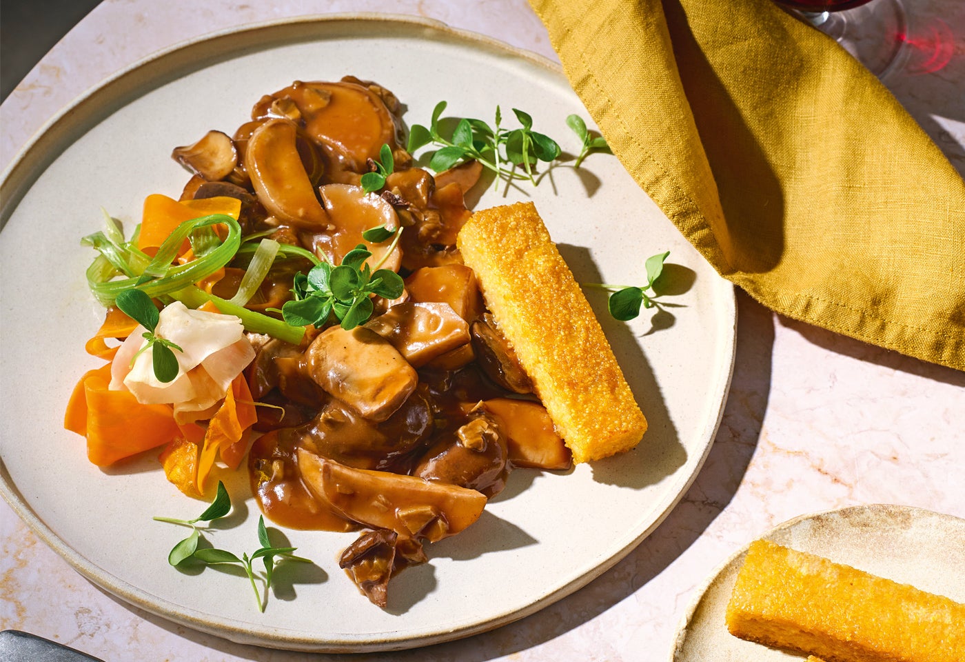 Pilz-Bourguignon mit Wurzelgemüse und Polentastäbchen
