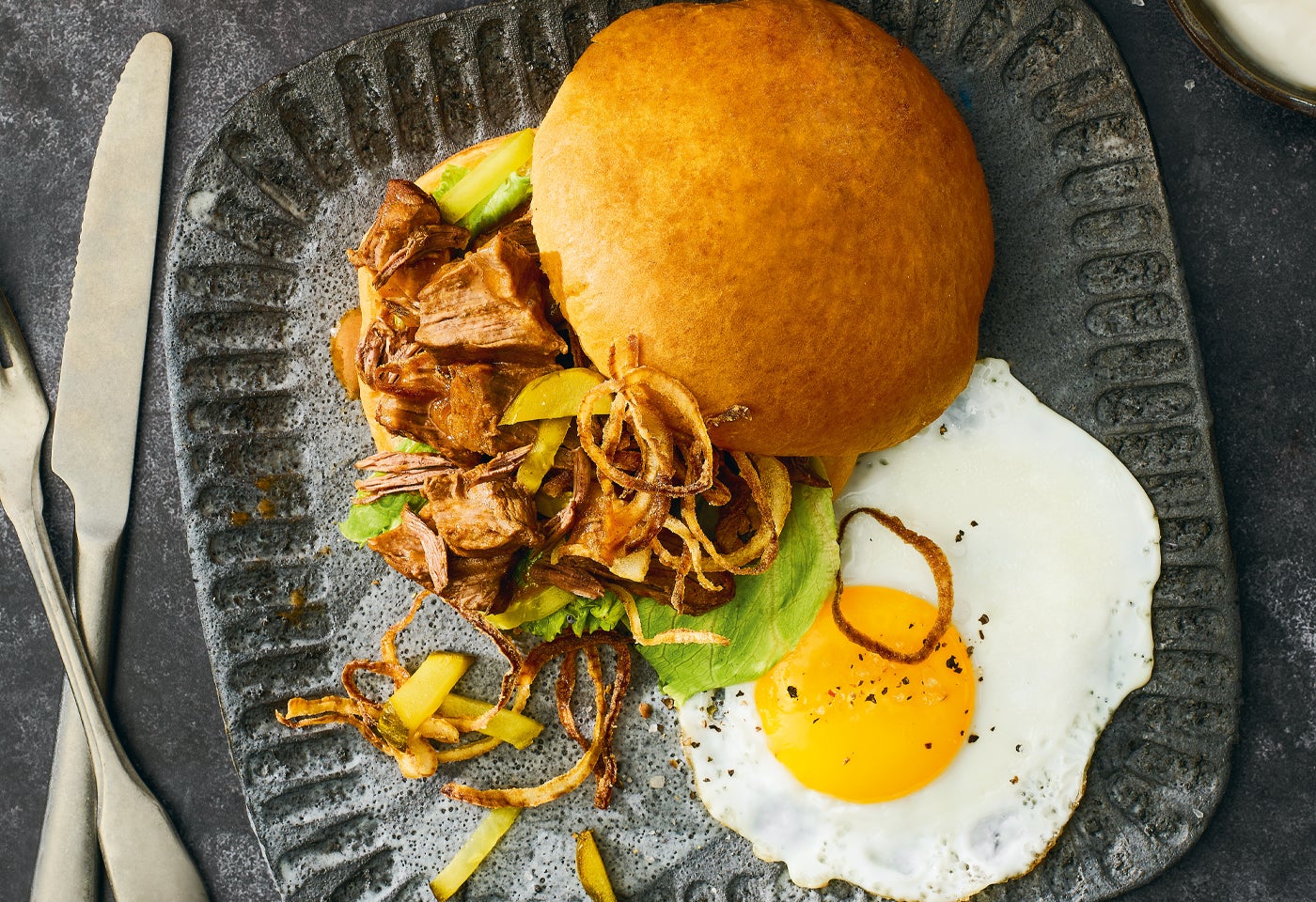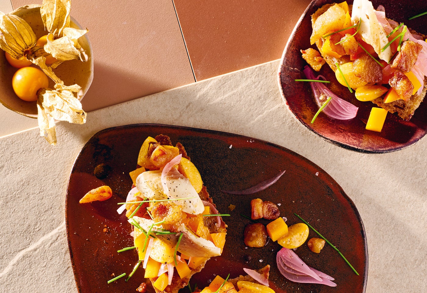 Pulled-Räuchersaibling-Brote mit Weißweinkürbis und Grammeln