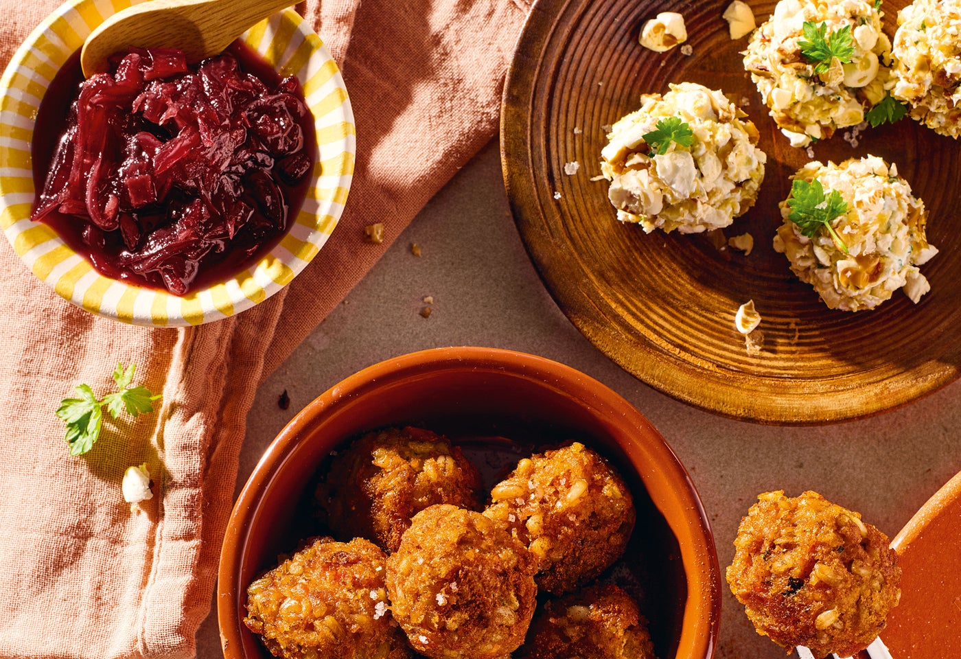 Popcorn-Ziegenfrischkäse und Tomate-Hafer-Bällchen mit Zwiebelchutney