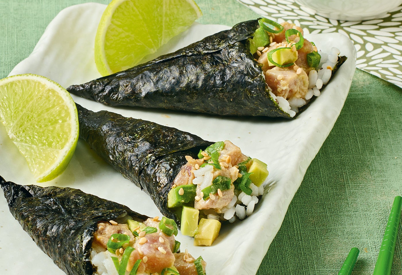Thunfisch-Avocado-Temaki-Sushi mit Wasabi