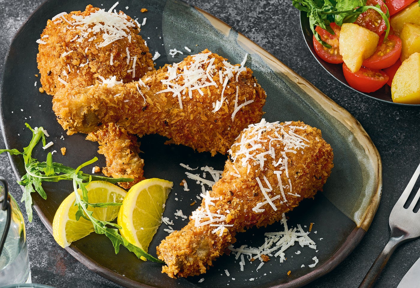 Parmesan-Backhendlkeulen mit Erdäpfel-Tomaten-Rucola-Salat