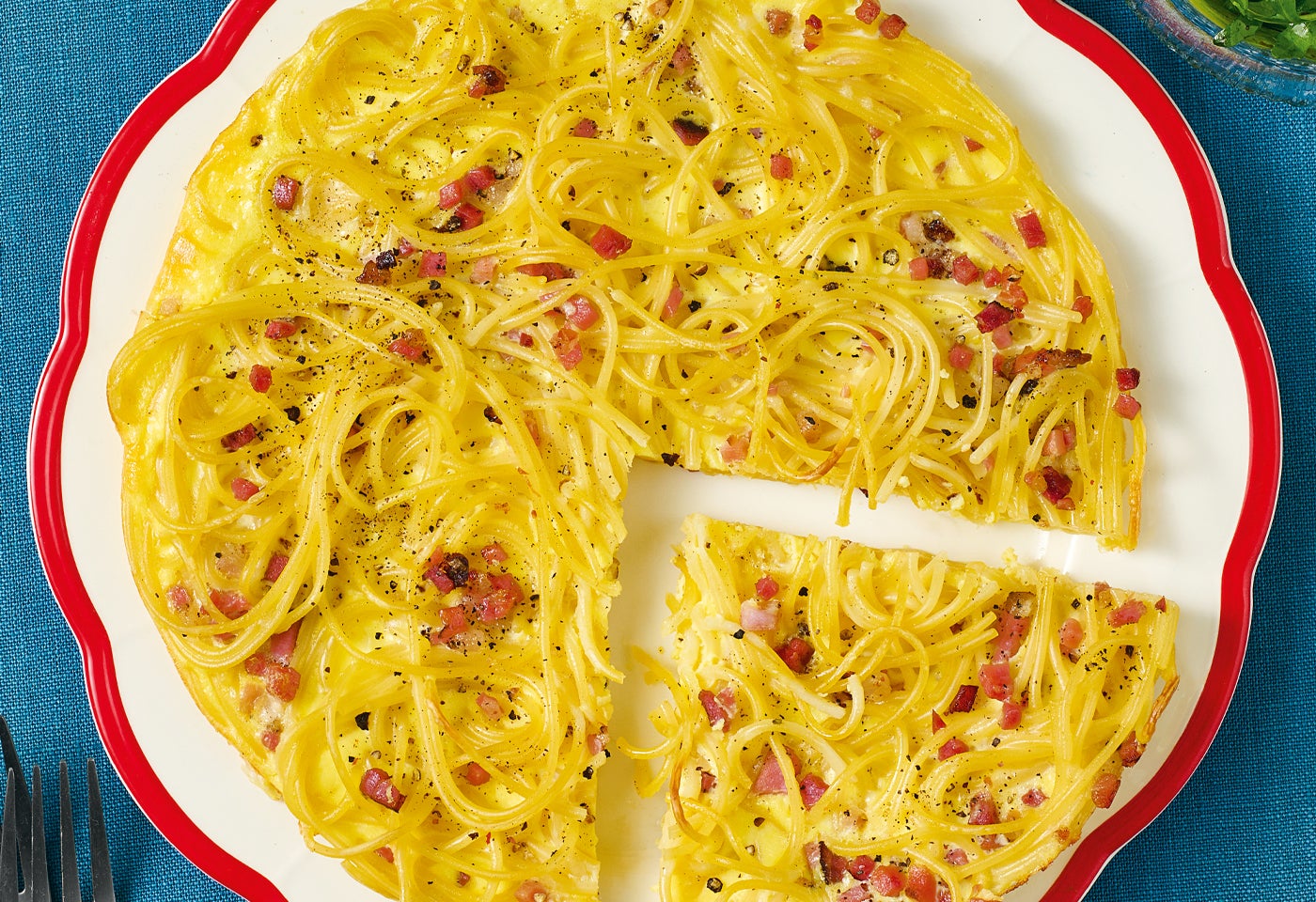 Spaghetti-Frittata mit Speck, Parmesan und Rucolasalat