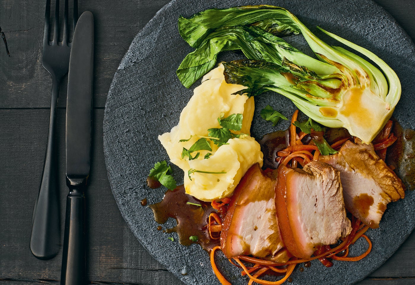 Honig-Soja-lackierter Schweinsbraten mit Pak Choi