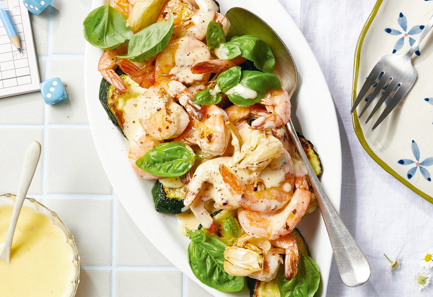 Gebratene Garnelen mit Zucchini und Zitronensauce