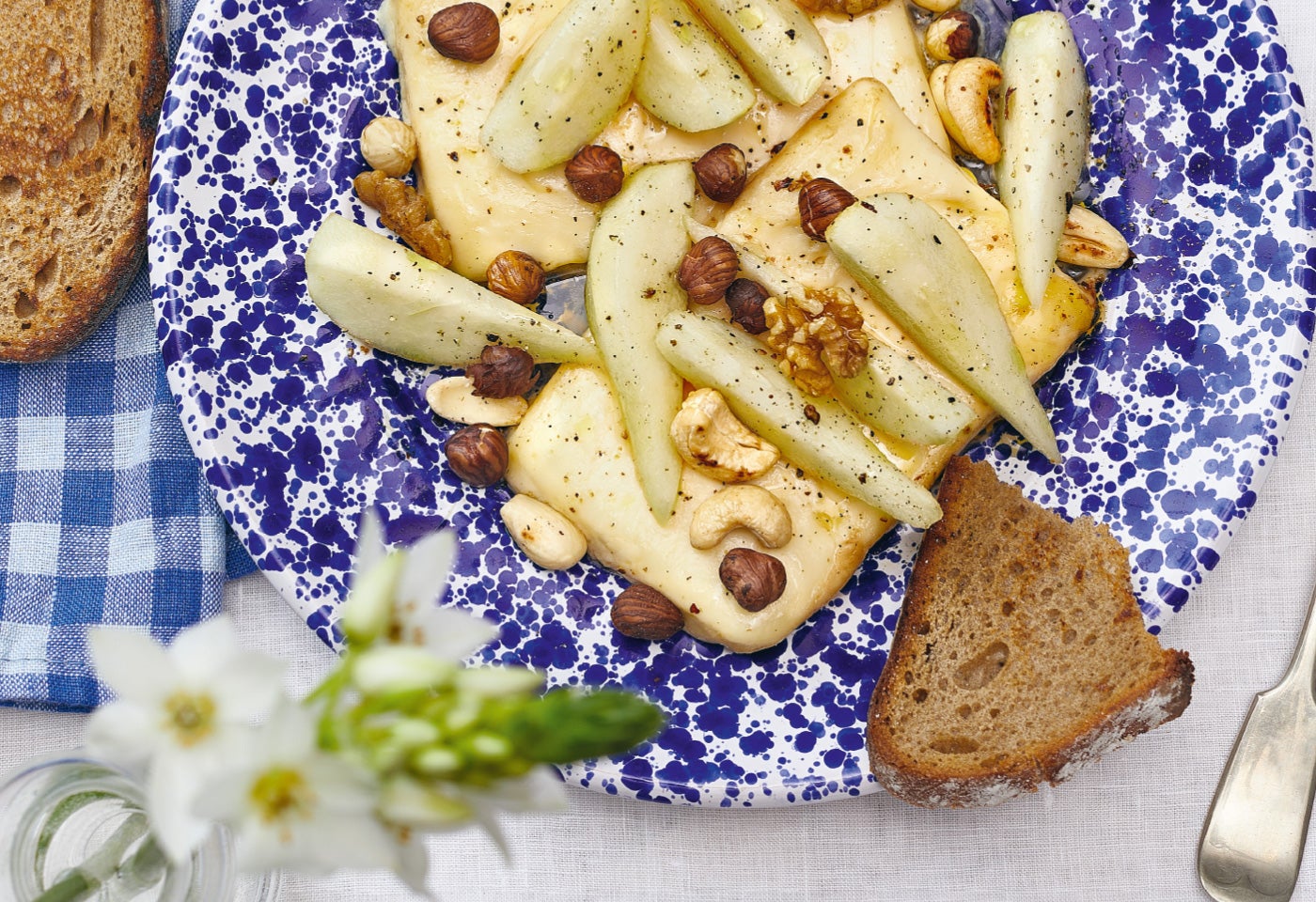 Gebratener Hirtenkäse mit Birnen und Nüssen