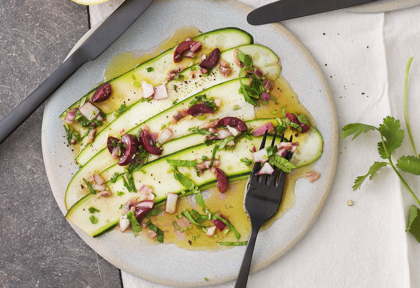 Zucchini-Carpaccio mit Oliven-Anchovis-Vinaigrette