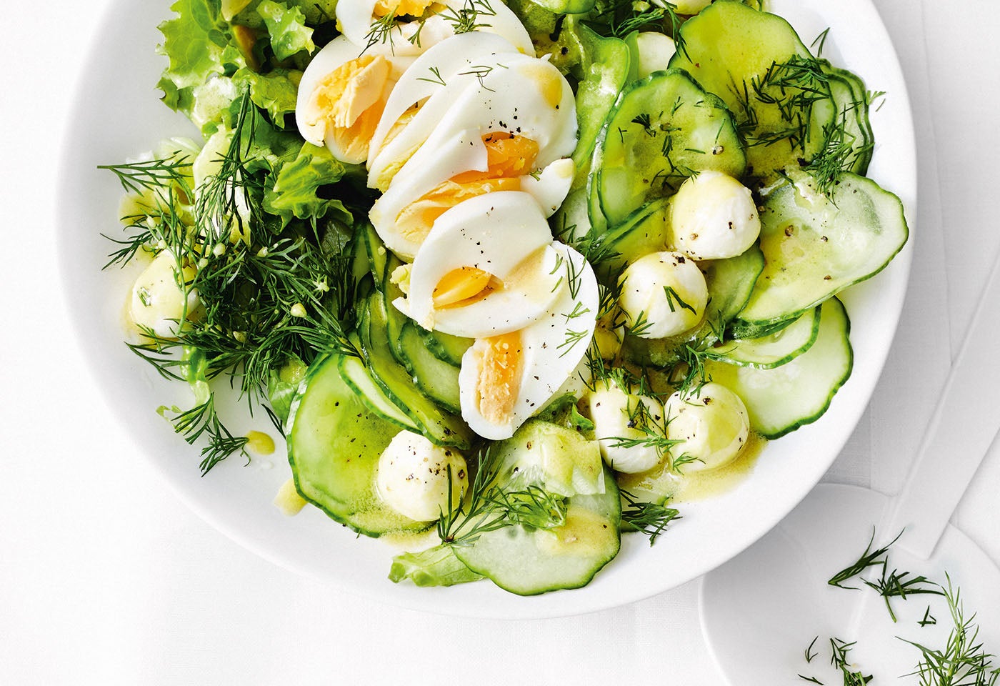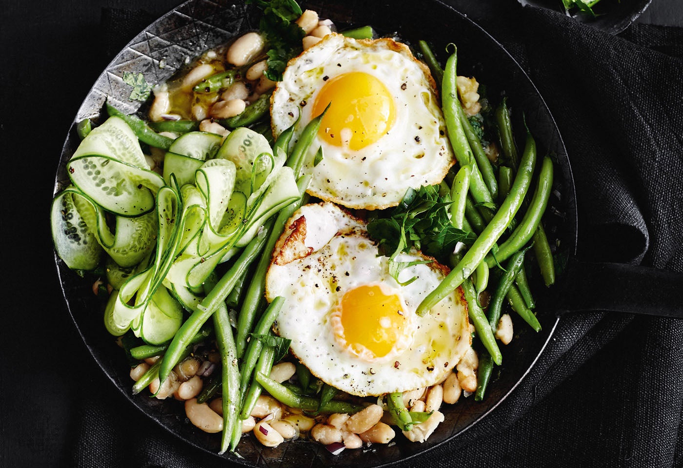 Bohnen-Fisolen-Pfanne mit Spiegelei und Gurke