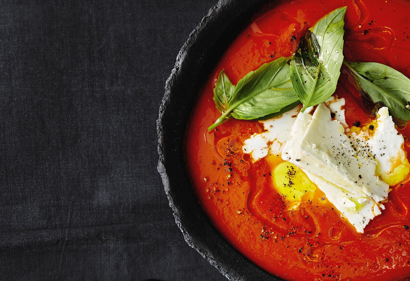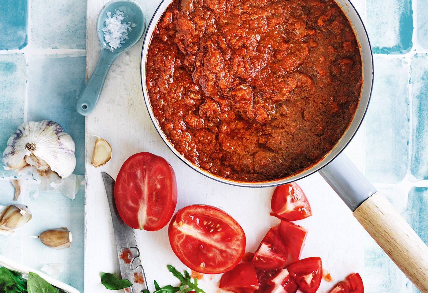 Tomatensugo mit Oliven, Rucola und Basilikum