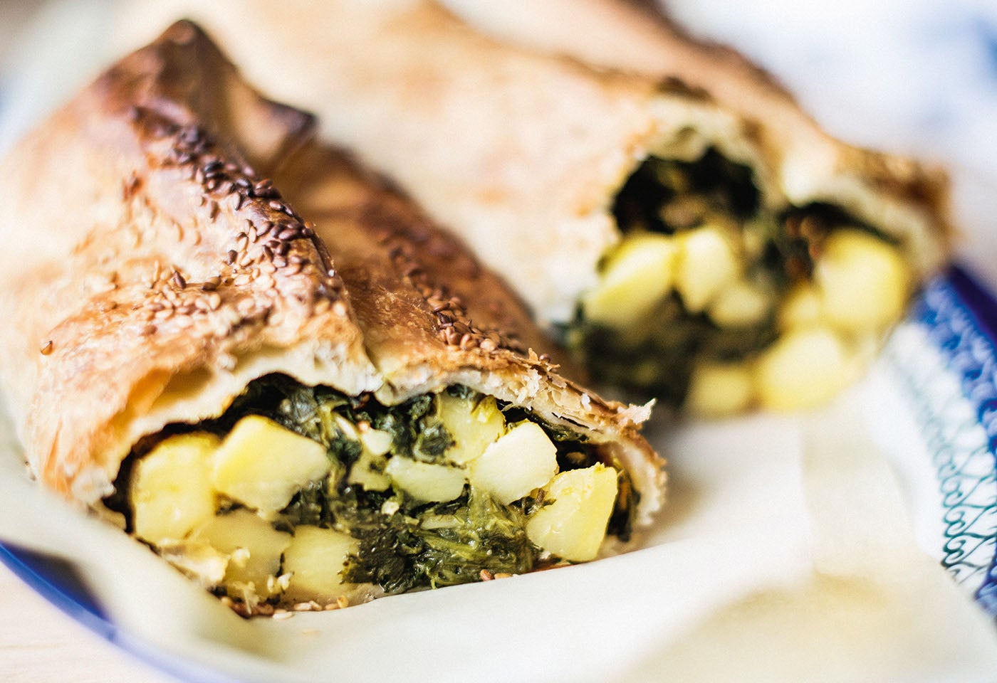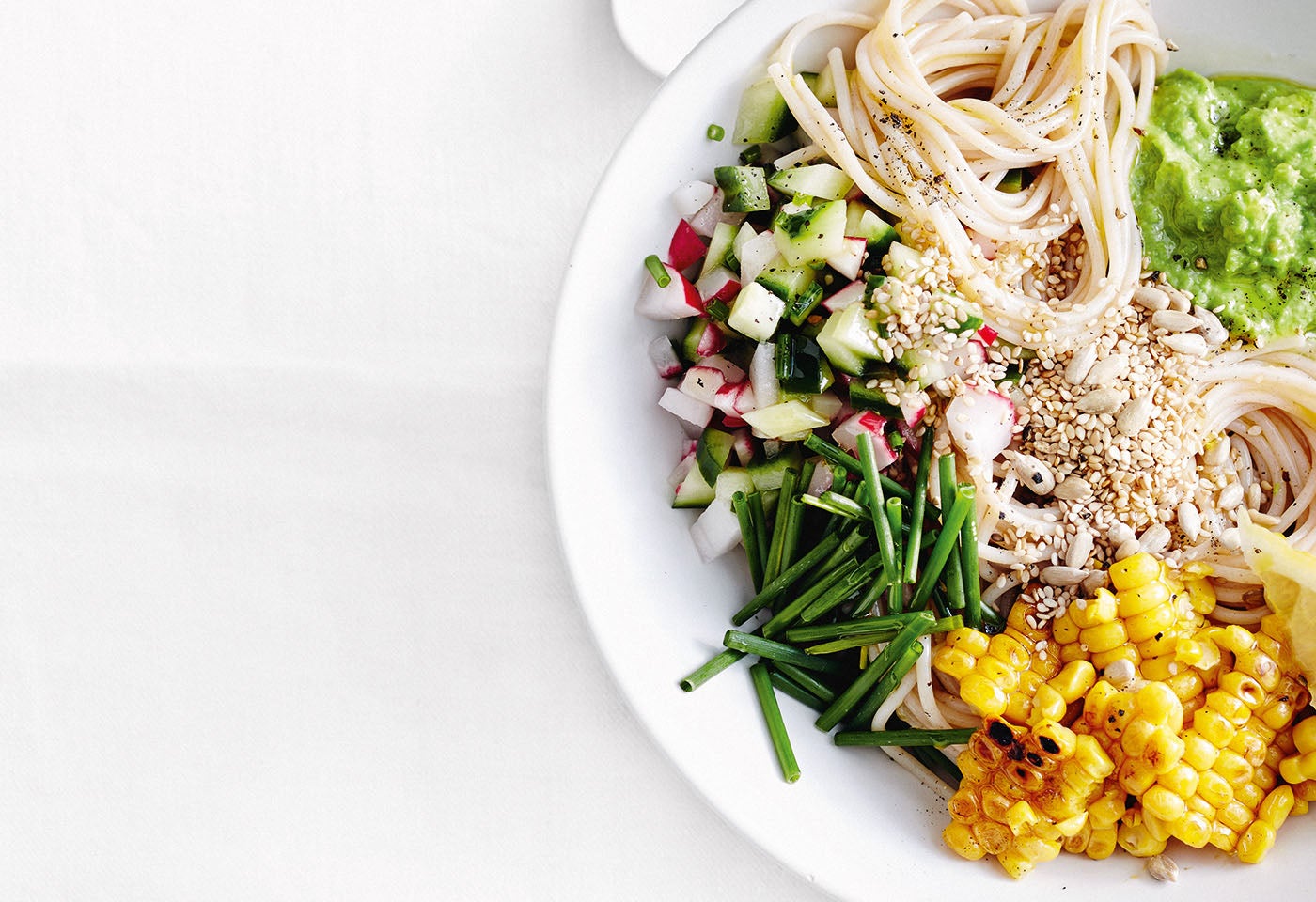 Vegane Spaghetti-Bowl mit Erbsen-Sesammus und Gurkensalsa