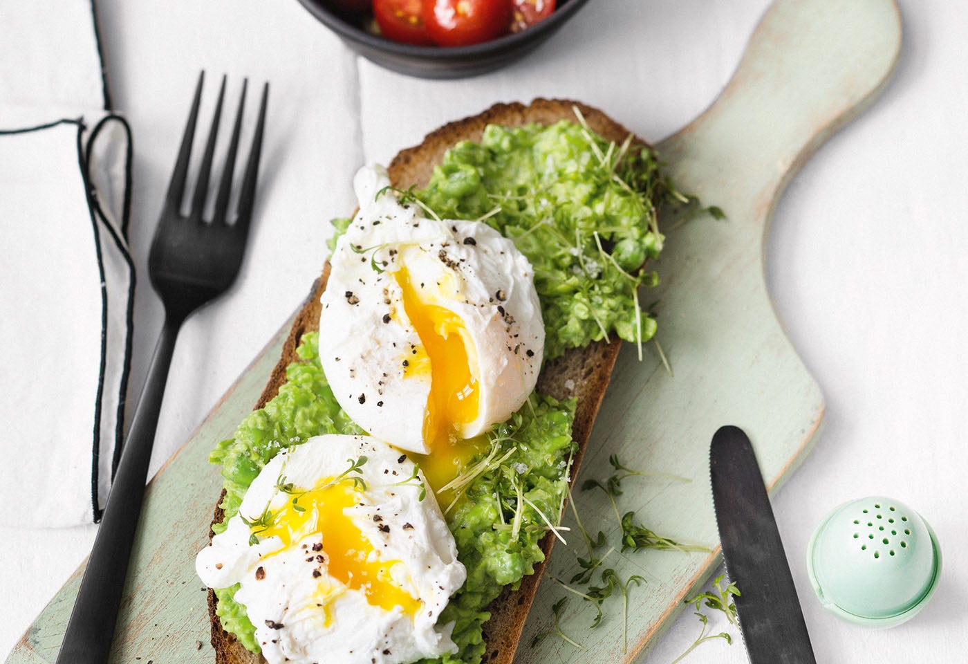 Erbsenbrot mit pochierten Eiern und Tomatensalat