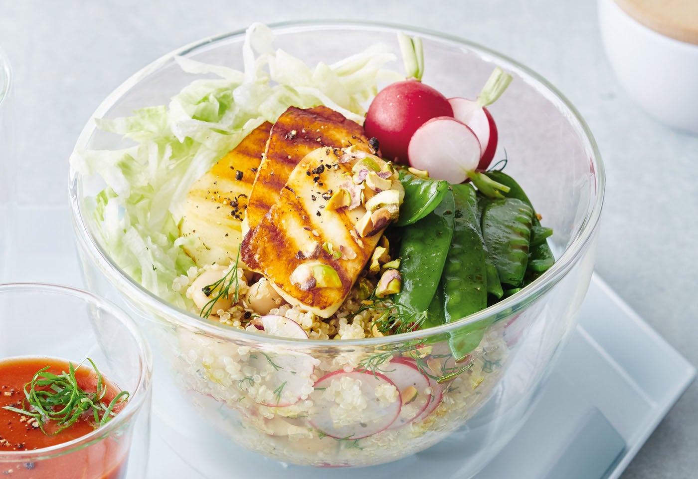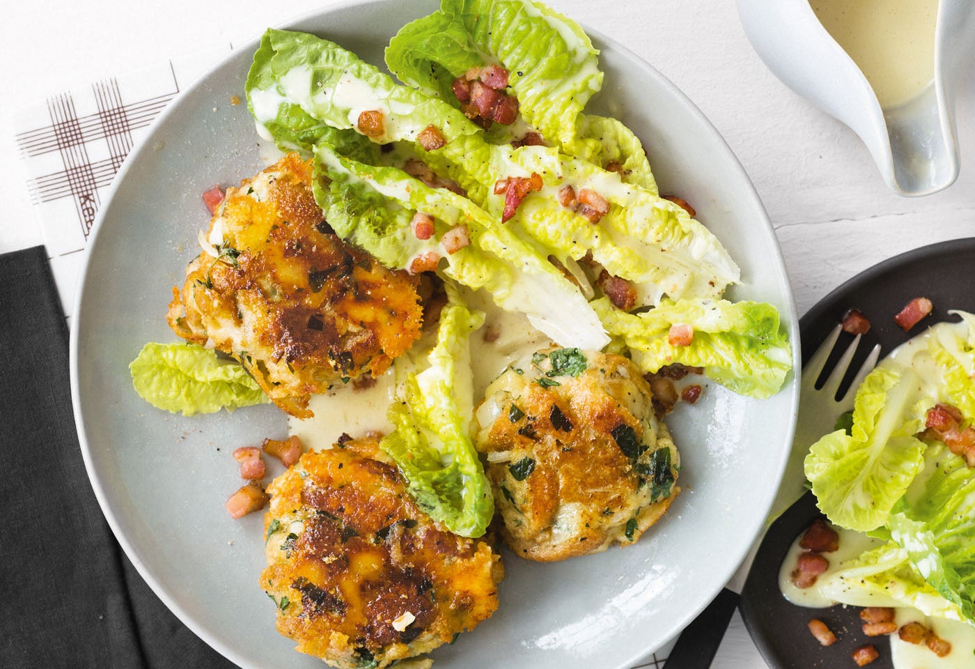 Couscous-Laibchen mit Avocadocreme und Krautsalat