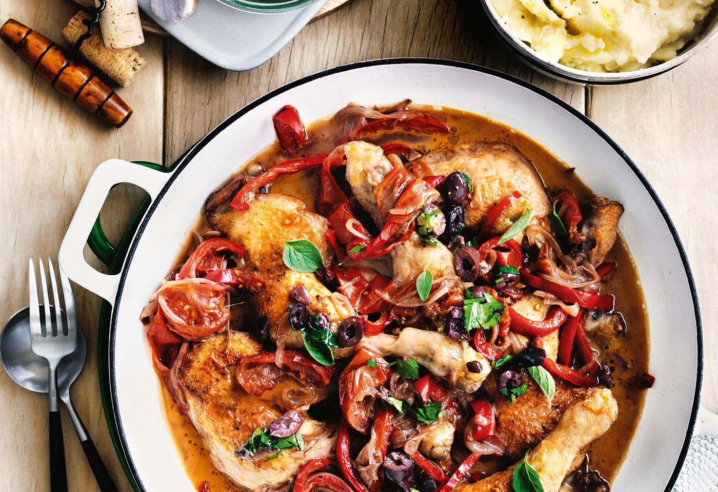 In Rotwein geschmorte Hühnerkeulen mit Erdäpfelpüree und eingelegten Oliven