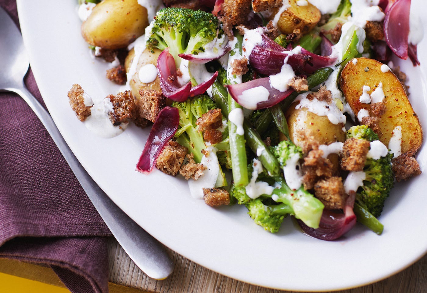 Erdäpfel-Gemüse-Salat mit Croûtons