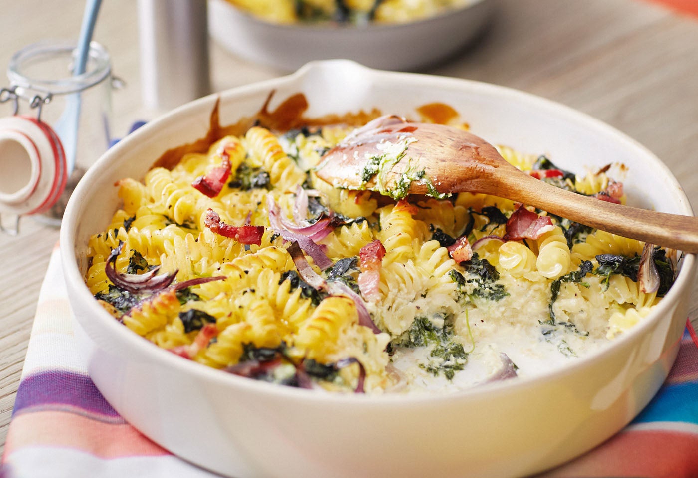 Nudelauflauf mit Ricotta, Spinat und Zwiebel