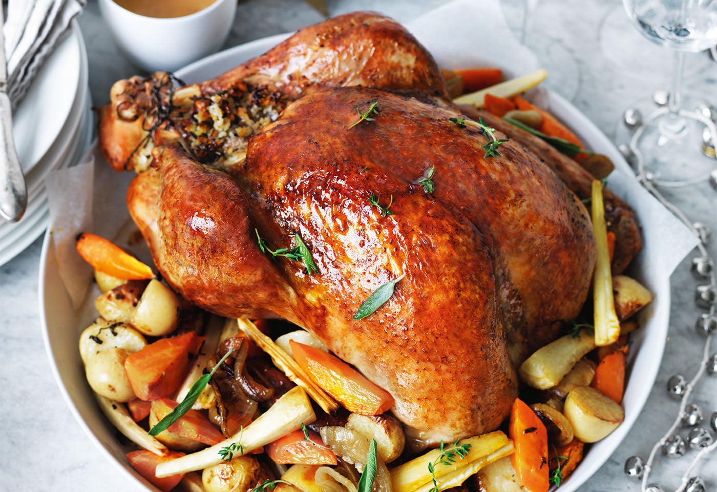 Gefüllter Minitruthahn mit Wurzelgemüse und Zitronen-Knoblauch-Butter