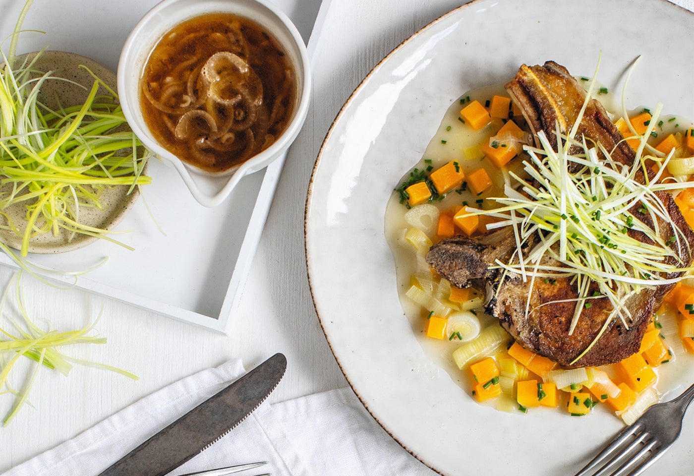 Schweinskotelett mit eingebranntem Kürbis und Lauch