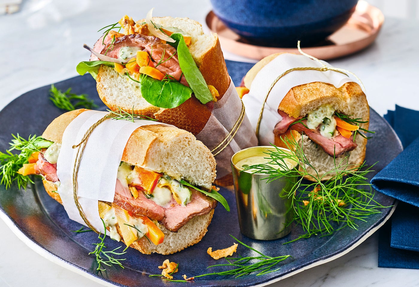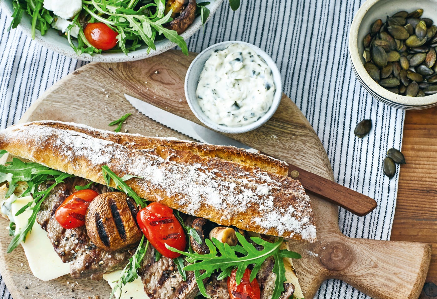 BBQ-Beiried-Sandwich mit Champignon-Grillsalat
