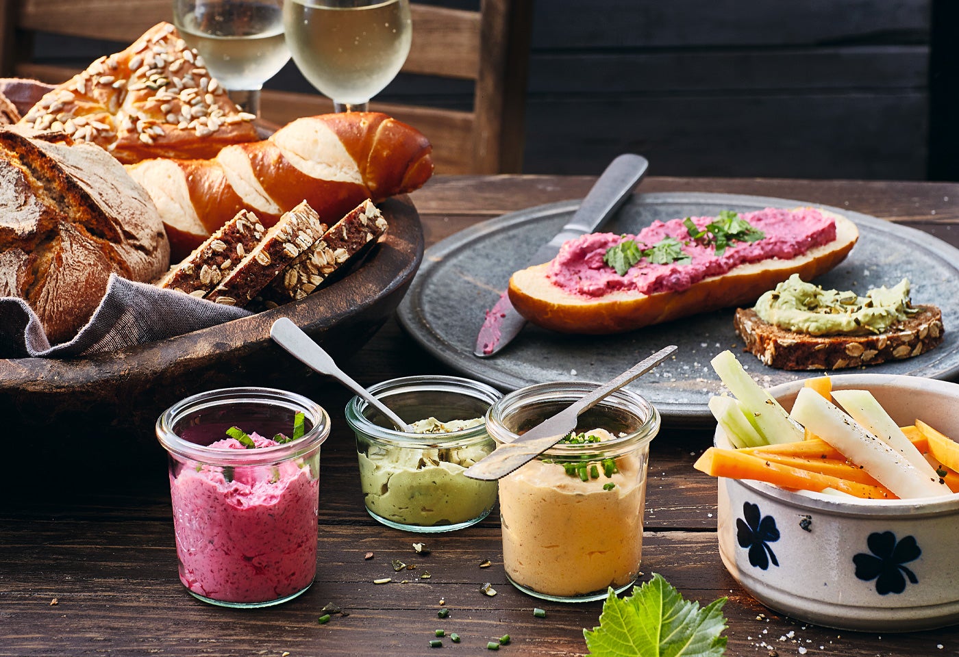Aufstrichteller mit Kürbiskern- aufstrich, Rote-Rüben-Aufstrich & Honig-Liptauer