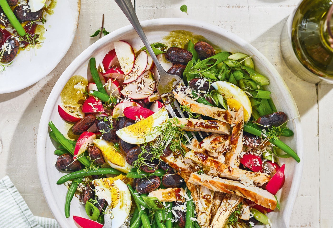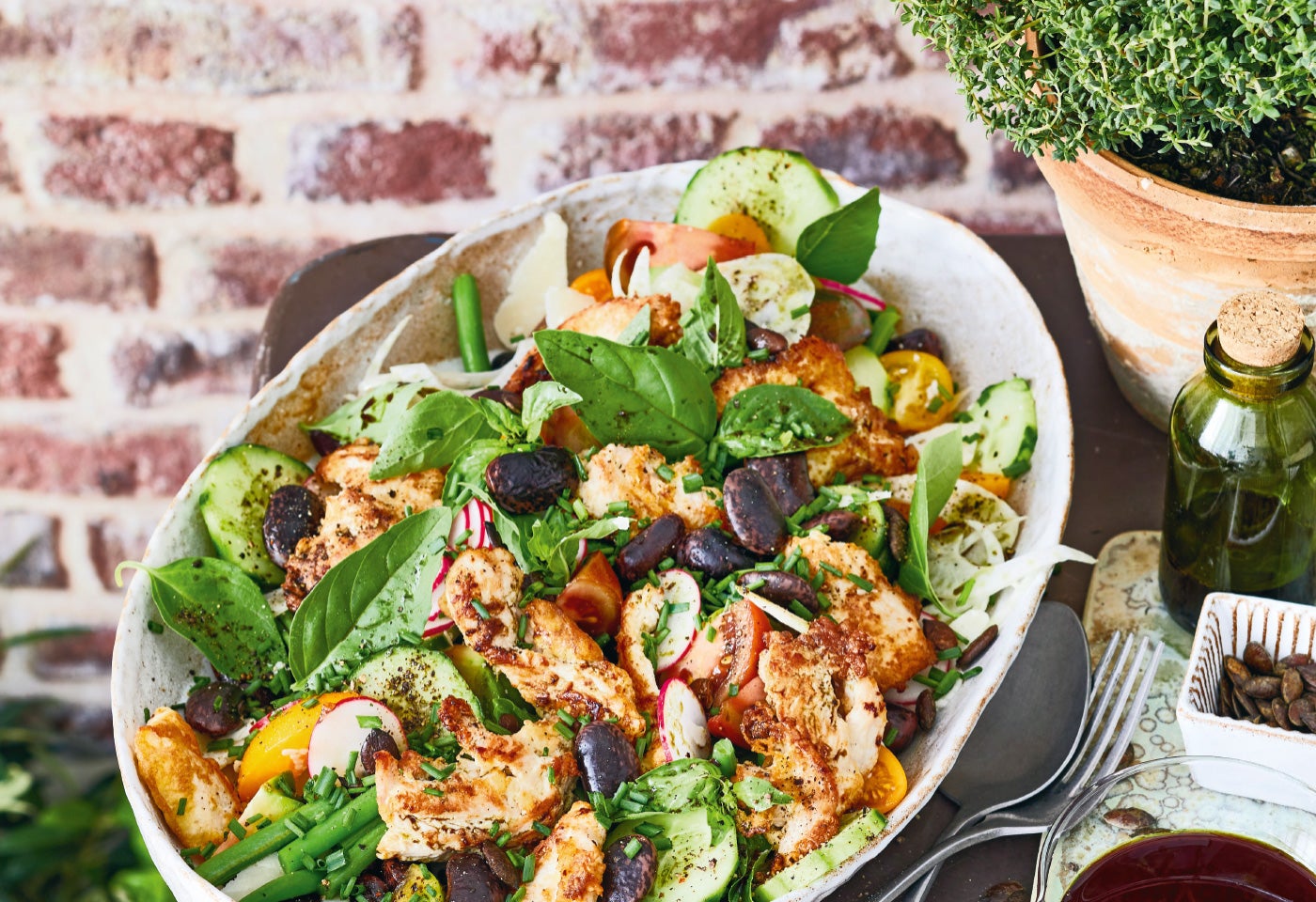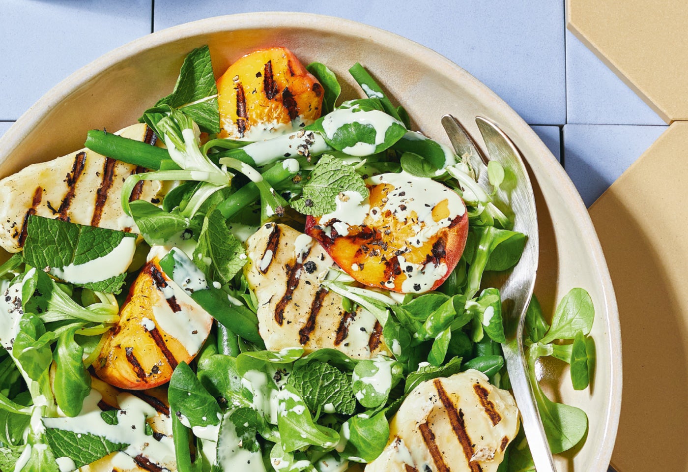 Halloumi-Pfirsich-Salat mit Fisolen und Vogerlsalat