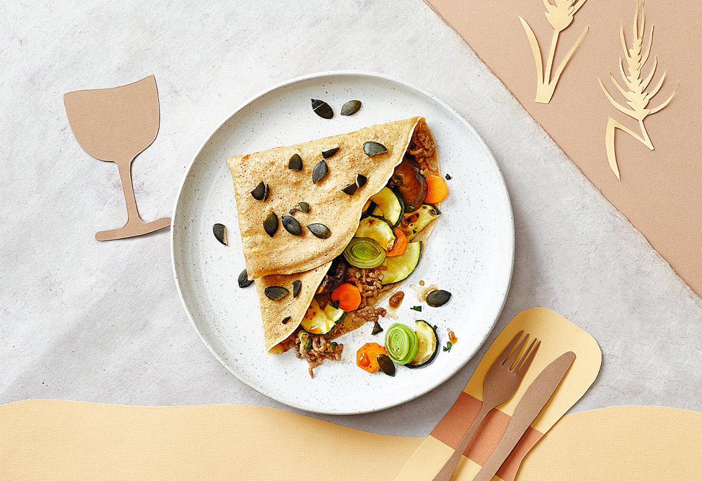 Vollkorn-Palatschinken mit Rindfleisch und Gemüse