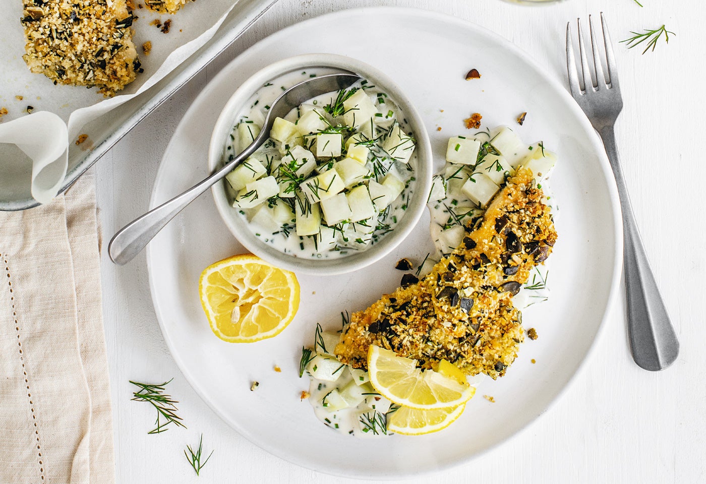 Forellenfilets in Krenpanier mit Kohlrabigemüse