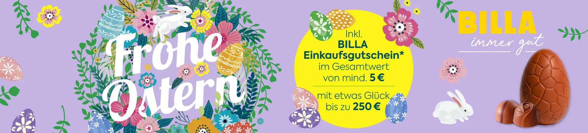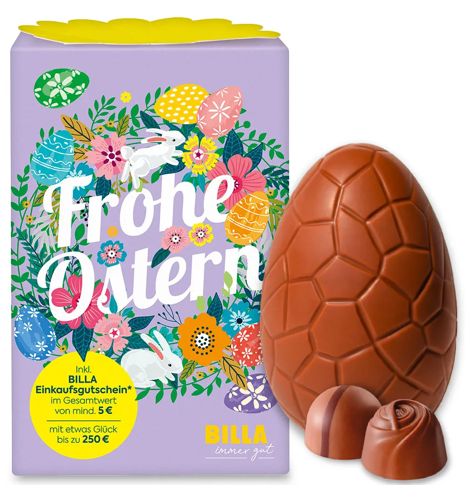 Unser BILLA immer gut Osterei steckt voller süßer Köstlichkeiten und Überraschungen: ein Schokoladenei mit 8 verschiedenen Pralinen, ein BILLA Einkaufsgutschein mit mind. € 5,- bis zu € 250,- Euro sowie eine -30% Aktionskarte für Kelly’s & Soletti, die Sie in den Märkten von BILLA und BILLA PLUS einlösen können.