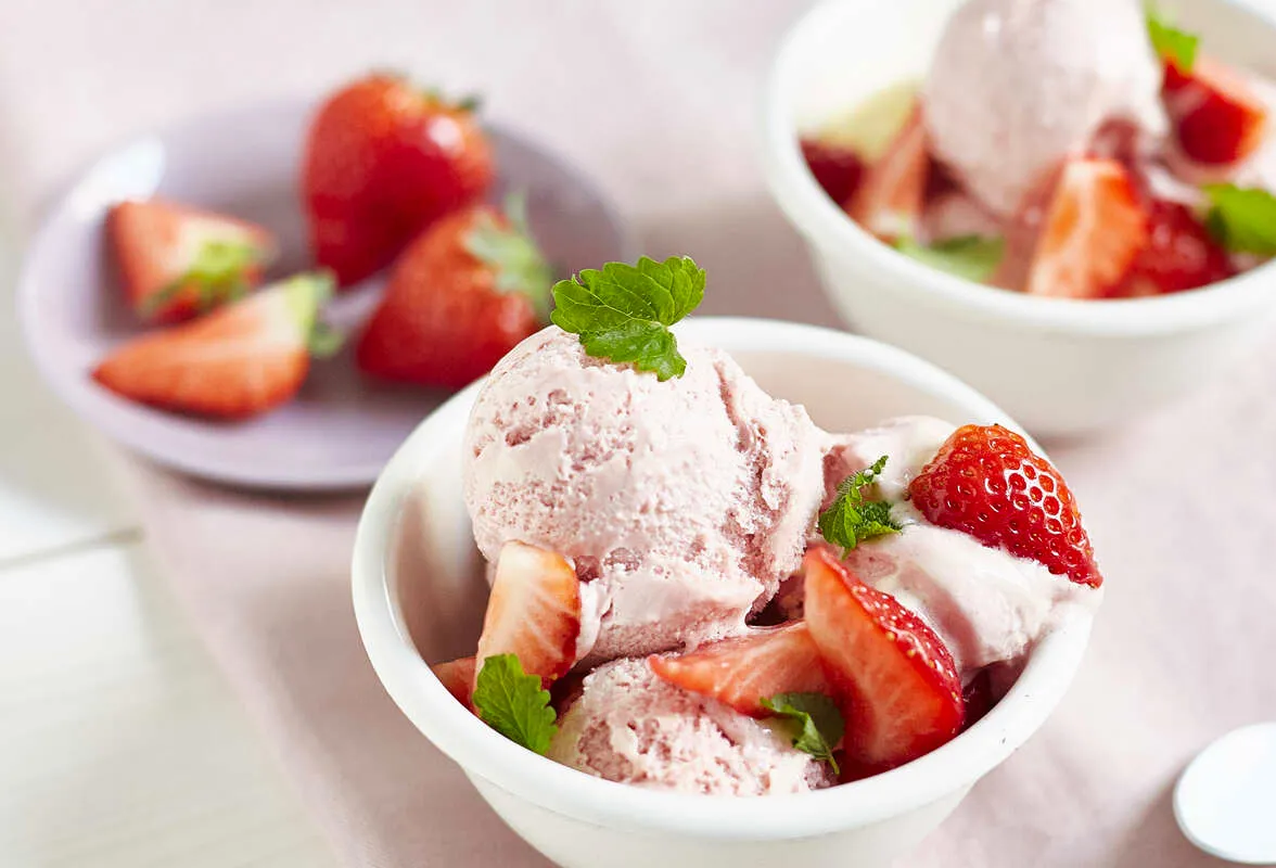 - 200g tiefgefrorene Erdbeeren gemixt mit 70g Mascarpone, 1 EL Honig, 2 Tropfen Vanille-Extrakt und einem Spritzer Zitronensaft, ein schnelles Erdbeereis ergeben.