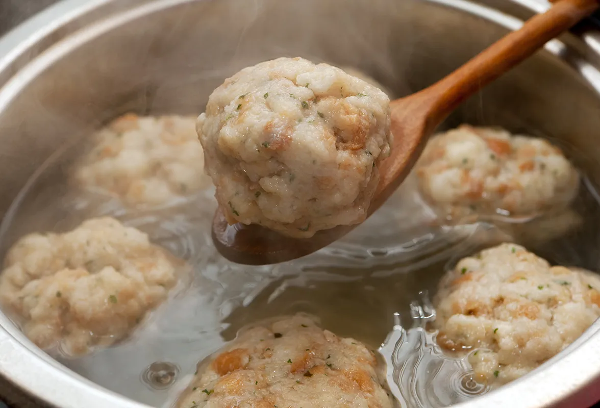 Gekochte Knödel am besten noch gefroren in siedendes Salzwasser geben, bis sie oben schwimmen. So werden sie gleichmäßig warm.