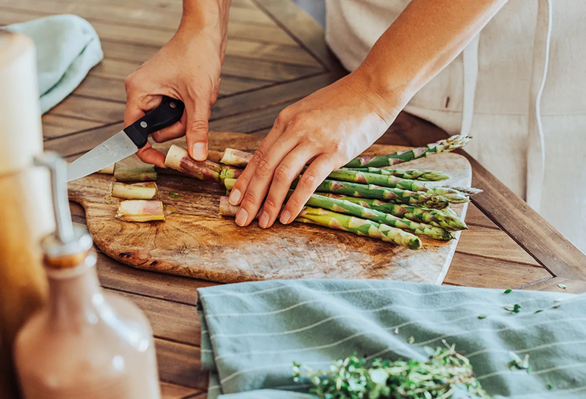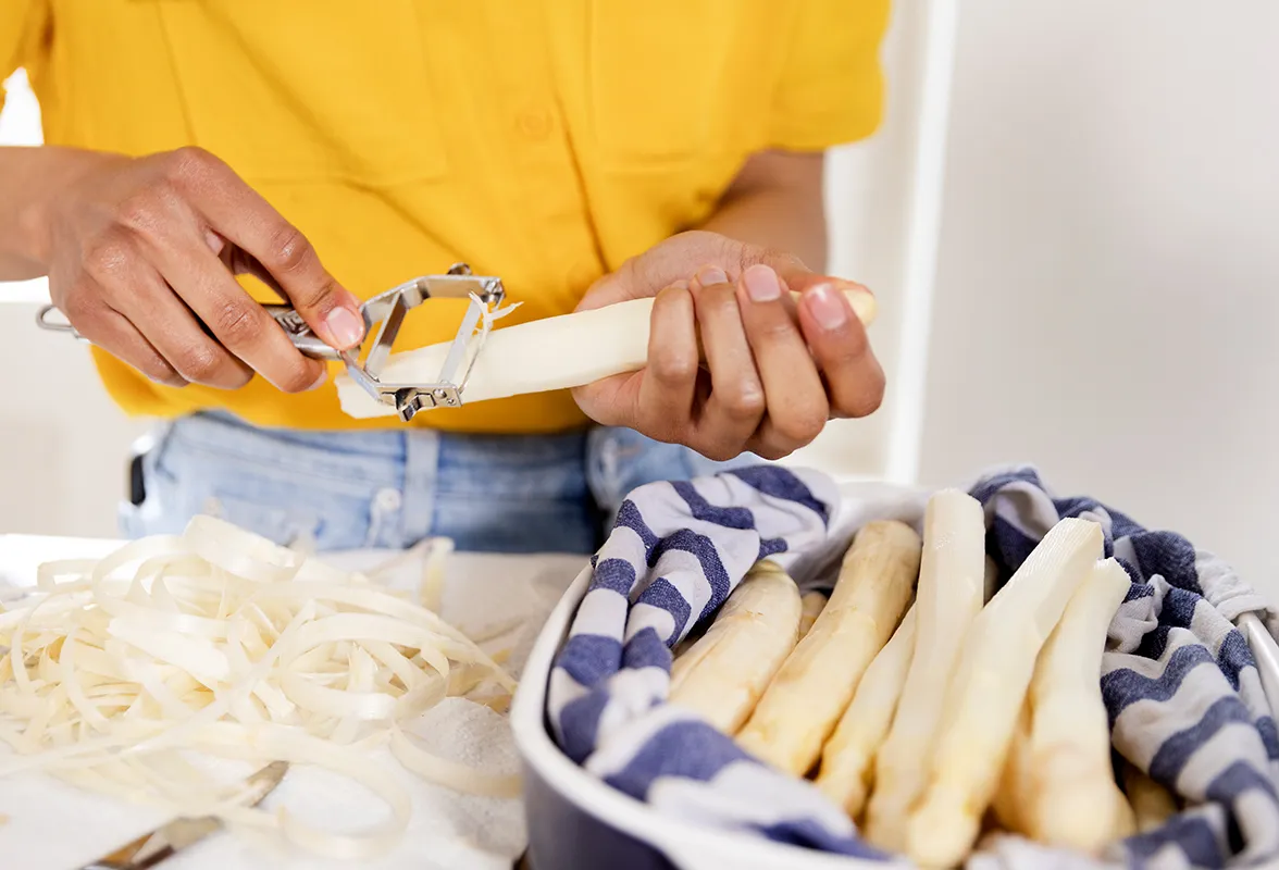 Hier gilt folgende Regel: Immer von oben nach unten schälen. Mit einem Sparschäler wird von der Spitze bis zum Ende vorsichtig die Schale entfernt. Um Brüche zu vermeiden, sollte man den Spargel mit der ganzen Hand umfassen – dabei immer auf die Fingerspitzen achten! Erst nachdem der Spargel geschält wurde, werden die holzigen Enden abgeschnitten. Bei frischem grünen Spargel ist es oft nicht notwendig, ihn zu schälen. Hier reicht es, 1-2 cm der holzigen Enden abzuschneiden.