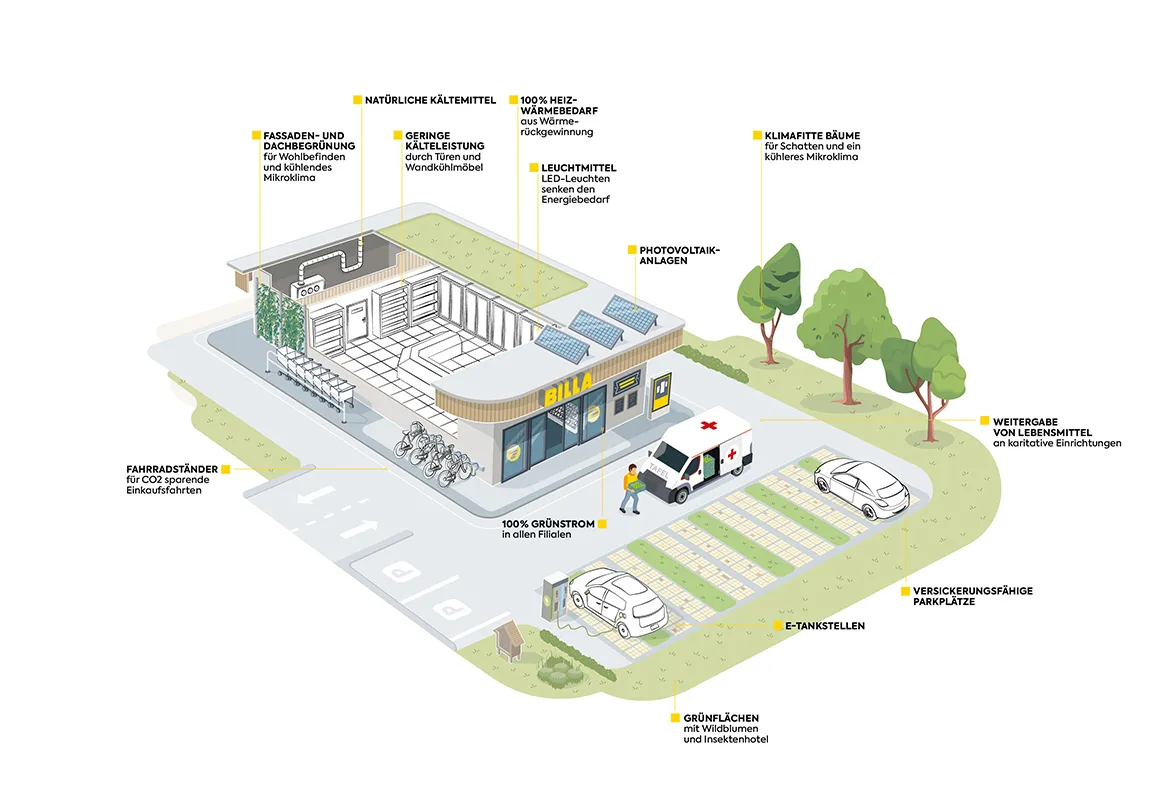 Mit unseren Märkten wollen wir tagtäglich einen Beitrag für ein nachhaltiges Österreich leisten. Von praktischen Fahrradständern und E-Tankstellen, über Photovoltaik-Anlagen auf den Dächern und 100 % Grünstrom, bis hin zu Grünflächen mit Insektenhotels und begrünte Fassaden für ein kühleres Mikroklima – wir setzen auf unterschiedlichste Maßnahmen, die wir gerne vorstellen.