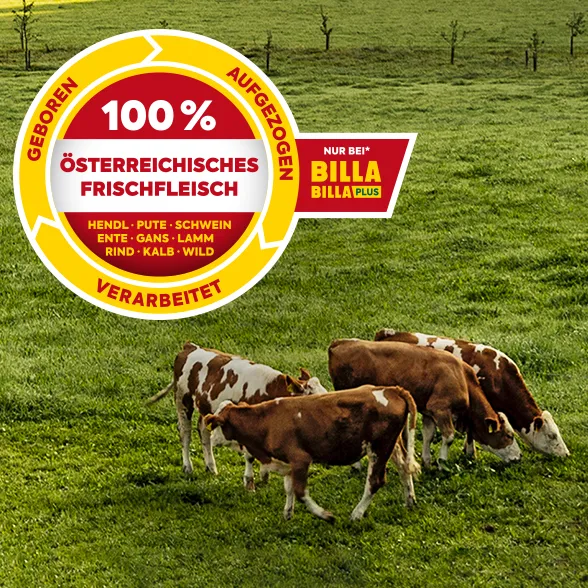 Bei Tierwohl war BILLA schon immer Vorreiter: Seit 2020 kommt unser Frischfleisch zu 100 % aus Österreich. Ein starkes Zeichen, damals wie heute einzigartig im heimischen Lebensmittelhandel – heute für uns schon eine Selbstverständlichkeit.
