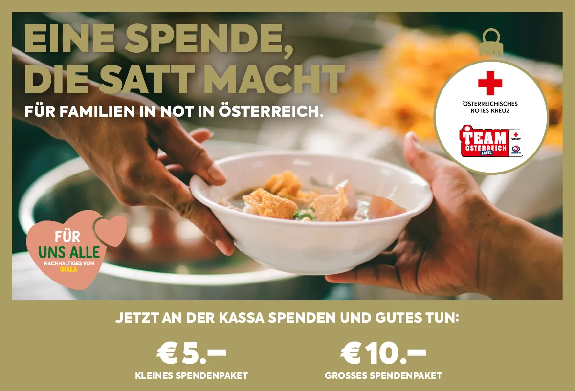 Mit einer Spende im Wert von € 5 oder € 10 für die „Team Österreich Tafel“ des Roten Kreuzes und Hitradio Ö3 haben BILLA Kund:innen die Möglichkeit sozial benachteiligte Mitmenschen mit den wichtigsten Grundnahrungs- und Hygieneartikeln zu unterstützen. Die Spende ist direkt an allen BILLA und BILLA PLUS Kassen durch Nennung des Spendenbetrages sowie durch Scannen des dort abgebildeten QR-Codes möglich.