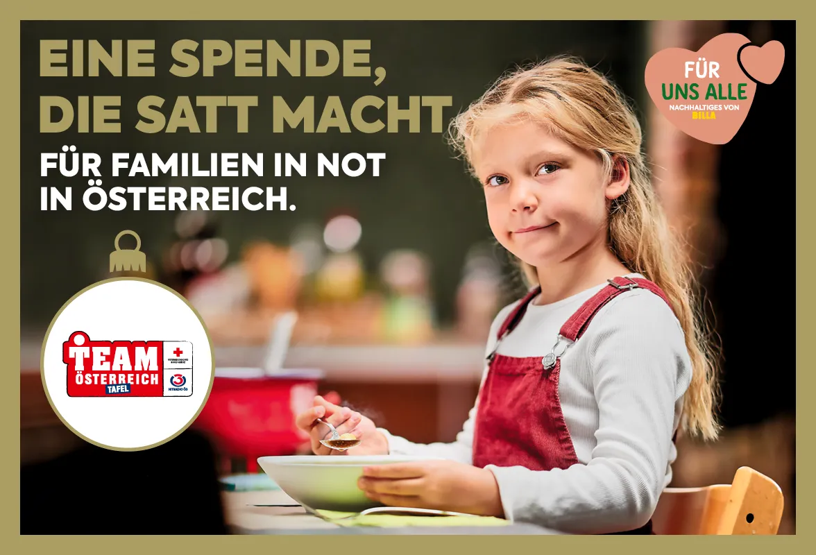 Mit einer Spende im Wert von € 1 für die „Team Österreich Tafel“ des Roten Kreuzes und Hitradio Ö3 haben BILLA Kund:innen die Möglichkeit sozial benachteiligte Mitmenschen mit den wichtigsten Grundnahrungs- und Hygieneartikeln zu unterstützen