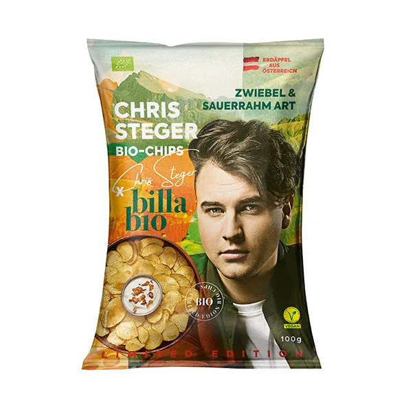 Die Bio-Chips in 2 Sorten sind nach dem Lieblingsgeschmack von Chris Steger im Kessel knusprig gebacken und überzeugen, genau wie er, durch Originalität und Heimatverbundenheit. Mit Erdäpfeln aus 100% österreichischer Bio-Landwirtschaft hergestellt, sowie palmölfrei und rein pflanzlich sind die Chips der perfekte Snack.