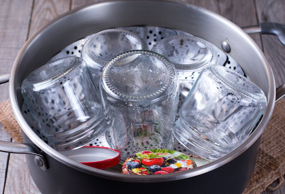 Beim Einkochen, Einmachen oder Fermentieren sollen Lebensmittel möglichst lange haltbar gemacht werden. Doch gerade wenn Behälter luftdicht verschlossen werden, können sich Bakterien gut vermehren. Deswegen müssen Einmachgläser möglichst keimfrei, also steril, sein. Das Sterilisieren von Einmachgläsern ist ganz einfach: Wasser in einem Topf zum Kochen bringen, Gläser inklusive Deckel in den Topf geben (die Gläser sollten vollständig mit Wasser bedeckt sein), zehn Minuten kochen lassen. Jetzt das Wasser abgießen und die Gläser vorsichtig aus dem Topf nehmen und auf einem sauberen Geschirrtuch umgedreht abtropfen lassen.