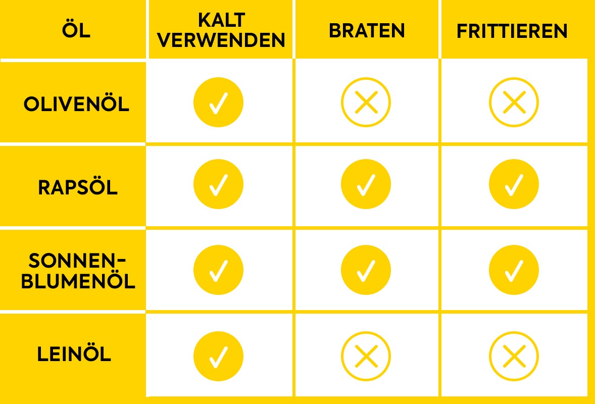 „Darf man das erhitzen?“, ist eine Frage, die wohl jeder schon einmal im Zusammenhang mit Öl gehört, oder sich sogar selbst gestellt hat. Unsere Hitzetabelle setzt dem Grübeln ein Ende: