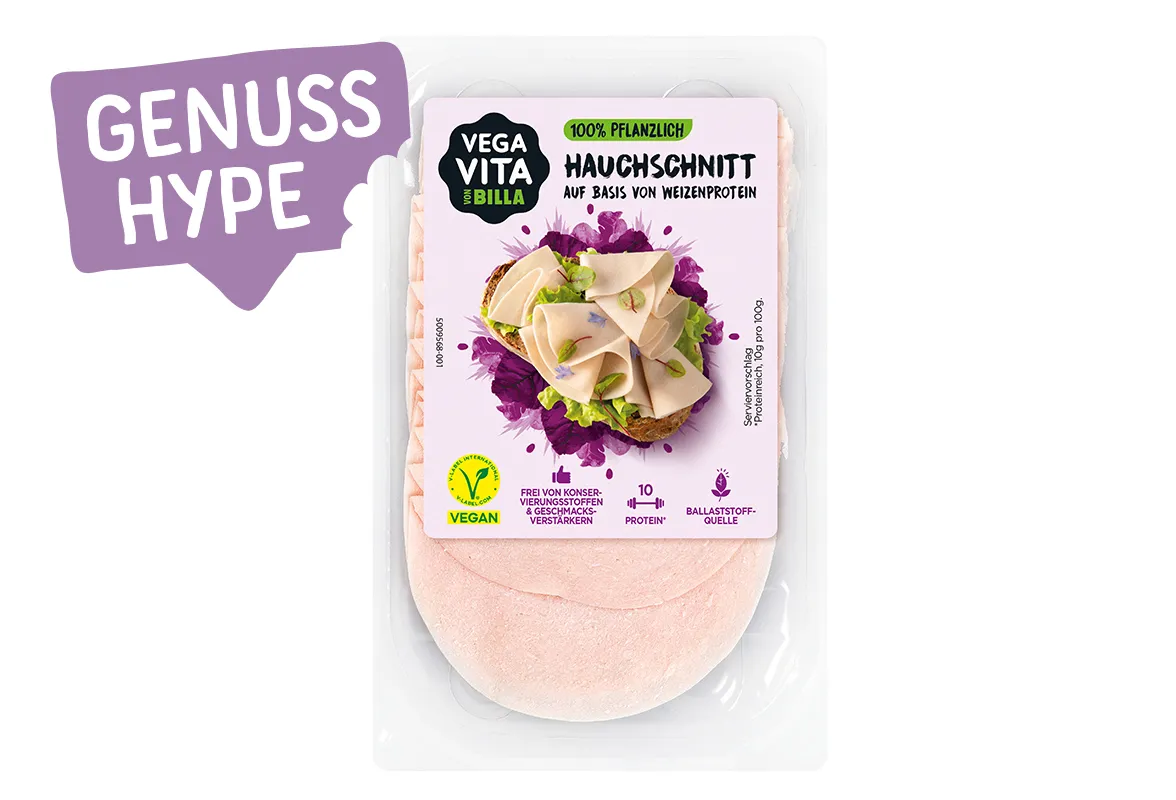 Rein pflanzlicher Genuss mit hohem Proteingehalt: Der neue Vegavita Hauchschnitt ist eine Aufschnitt-Alternative nach Hendlbrust-Art auf Basis von Weizenprotein. Fein geschnitten und ideal für die Jause, eignet sich diese Köstlichkeit perfekt für jedes Sandwich und macht auch in vielen warmen und kalten Gerichten eine tolle Figur. Der Vegavita Hauchschnitt ist außerdem frei von Konservierungsstoffen, Geschmacksverstärkern sowie künstlichen Aroma- und Farbstoffzusätzen.