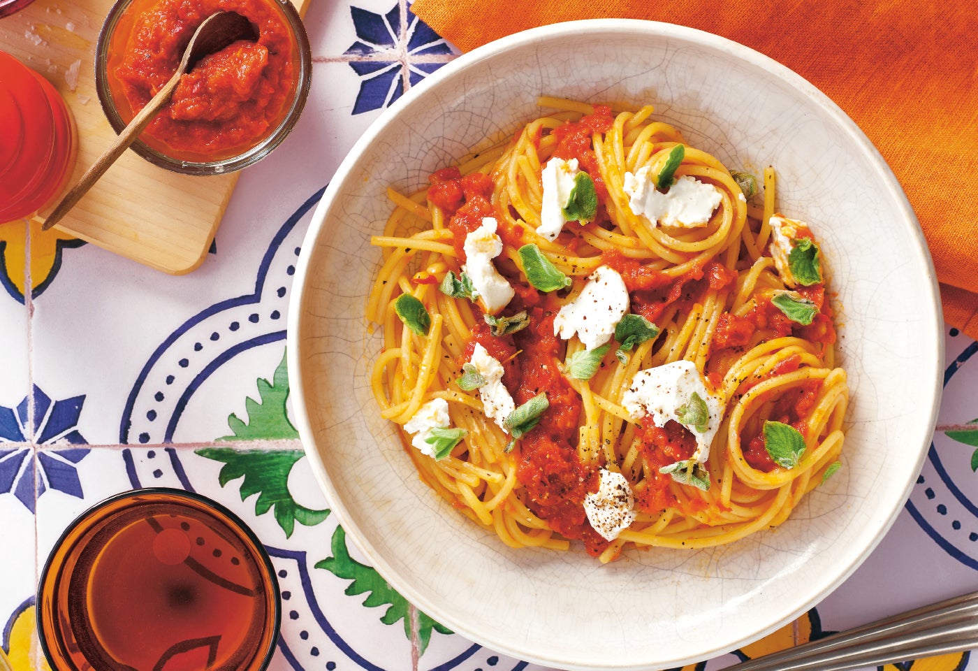 Spaghetti mit Ajvar und Ziegenfrischkäse