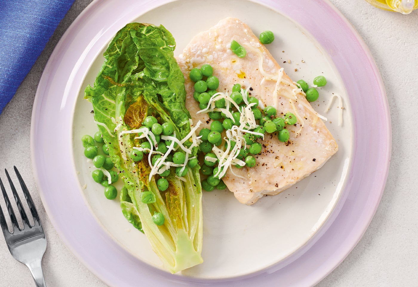 Wildlachsfilet mit gebratenem Salat und Erbsen