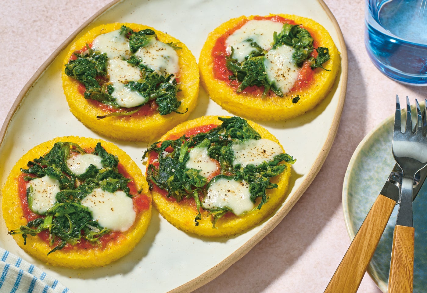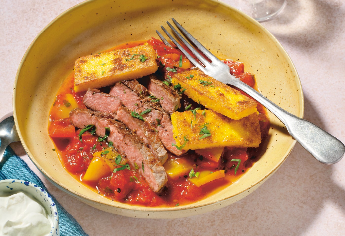 Polentastäbchen mit Tomaten-Paprika-Sauce und Rindssteak