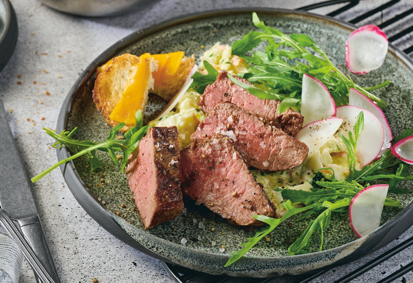 Rosa gegrilltes Minutensteak Rucola-Coleslaw und Cheddar-Grillbrot