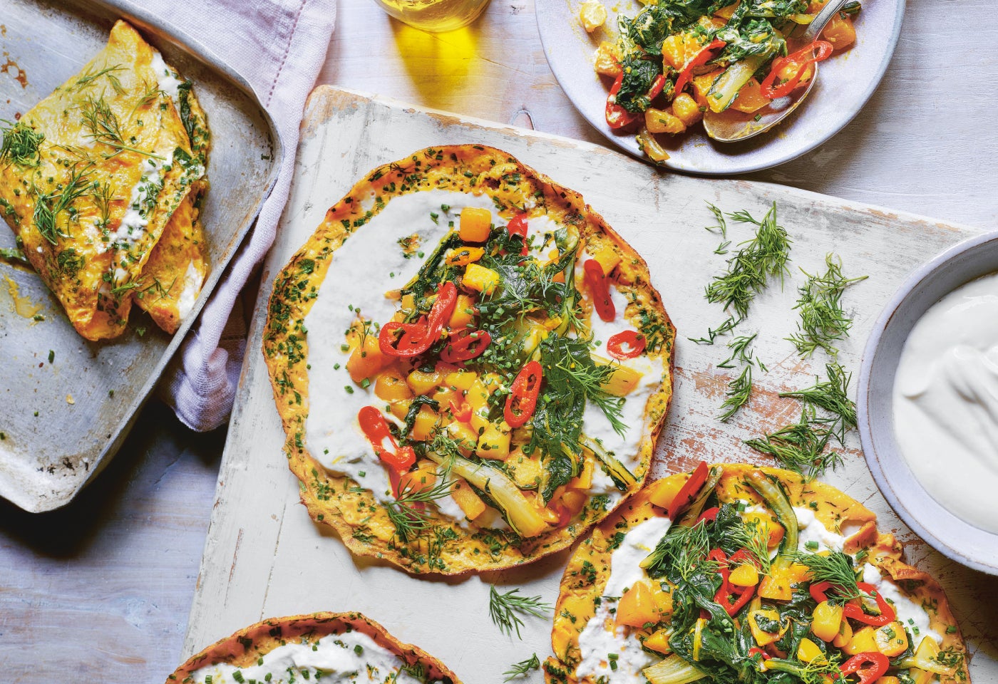 Mangold, Kartoffeln und Chili-Safran-Omeletts mit Joghurt