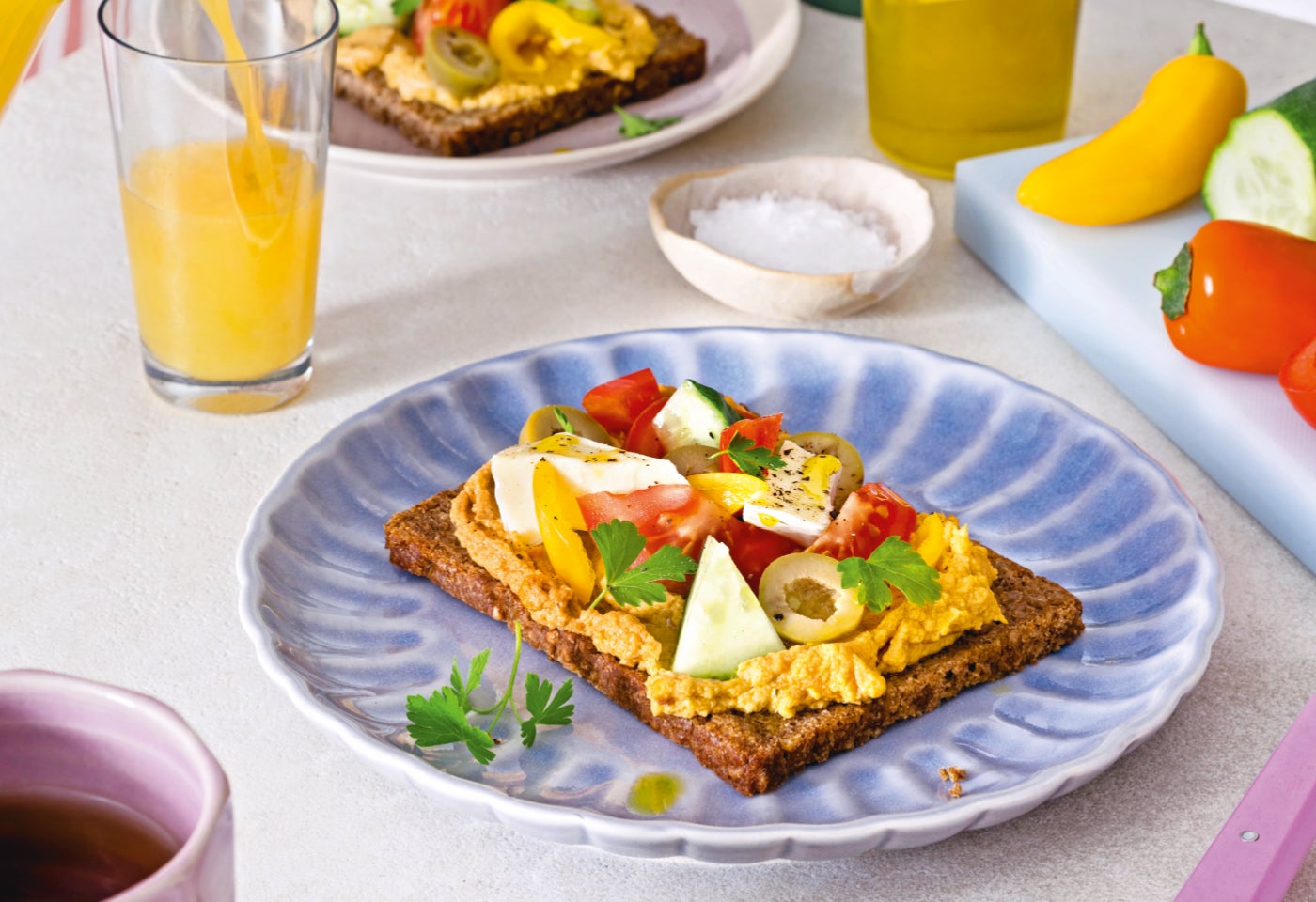 Belegtes Vollkornbrot mit Hummus, Brie und Gemüse