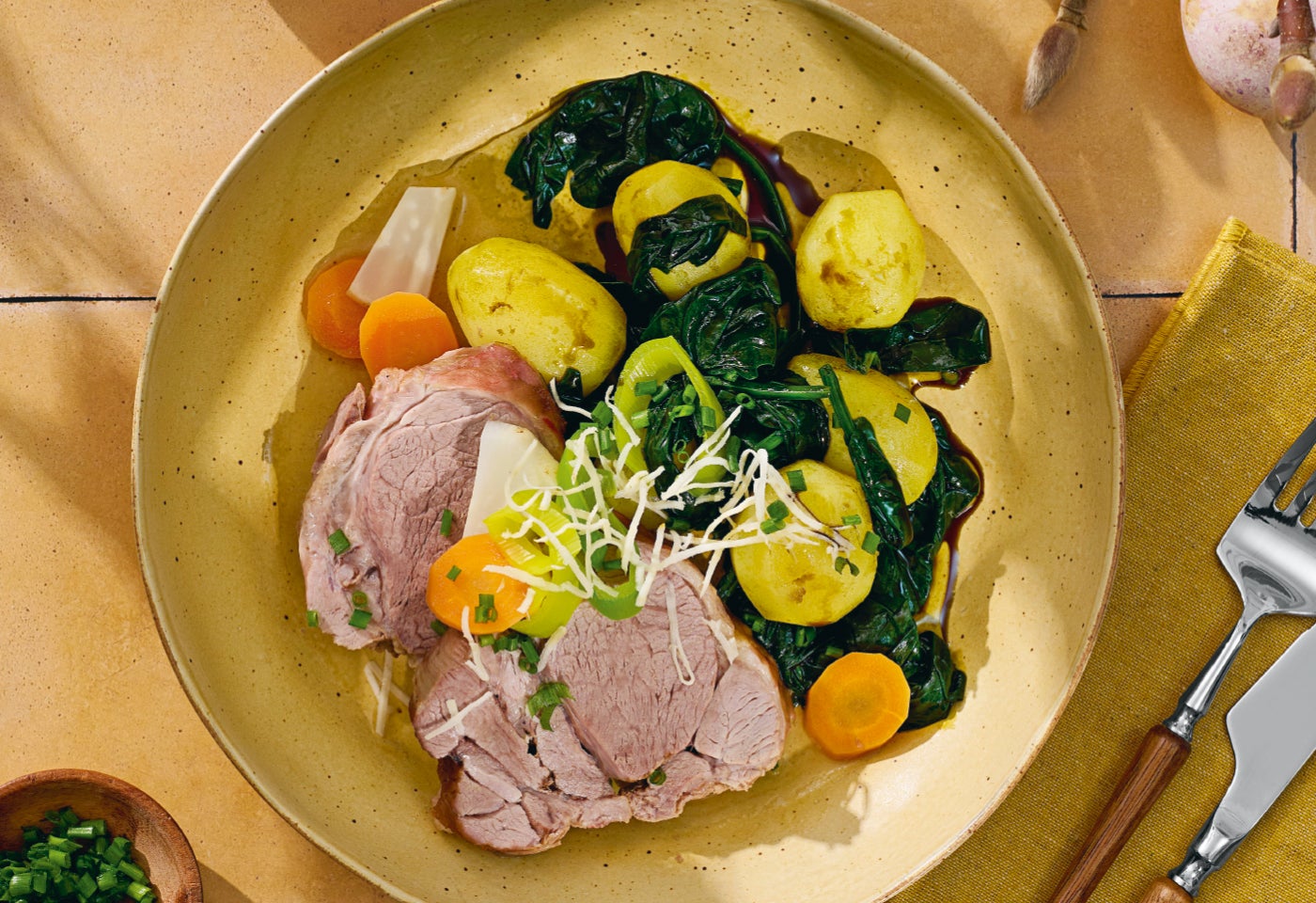 Lamm-Wurzelfleisch mit Kernöl-Spinat-Erdäpfeln