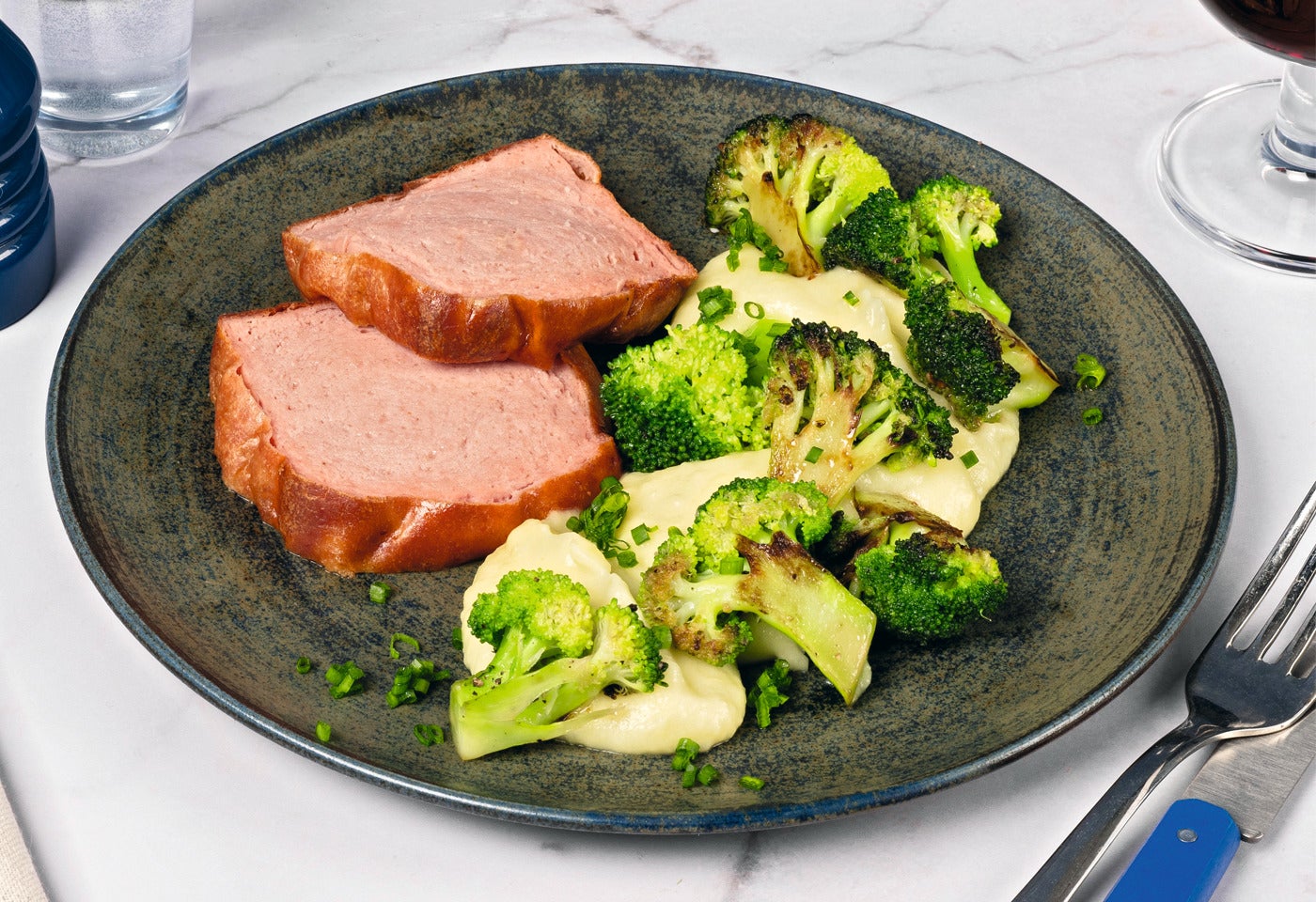 Backofen-Leberkäse mit Brokkoli und Erdäpfelpüree