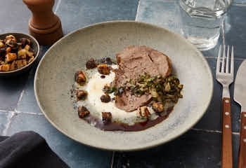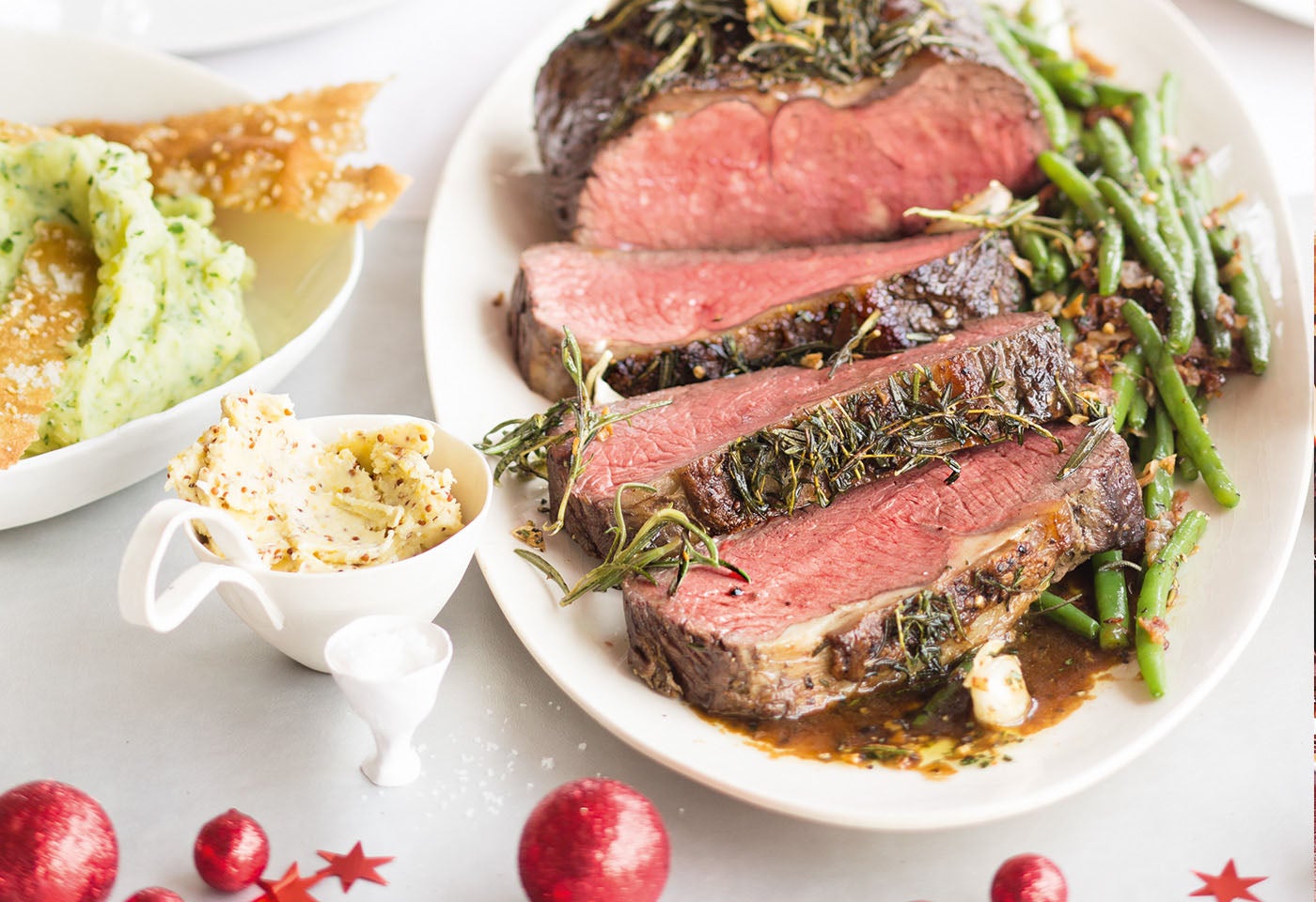 Beiried mit Fisolen, Honig-Senf-Butter, Kräuterpüree und Strudelchips