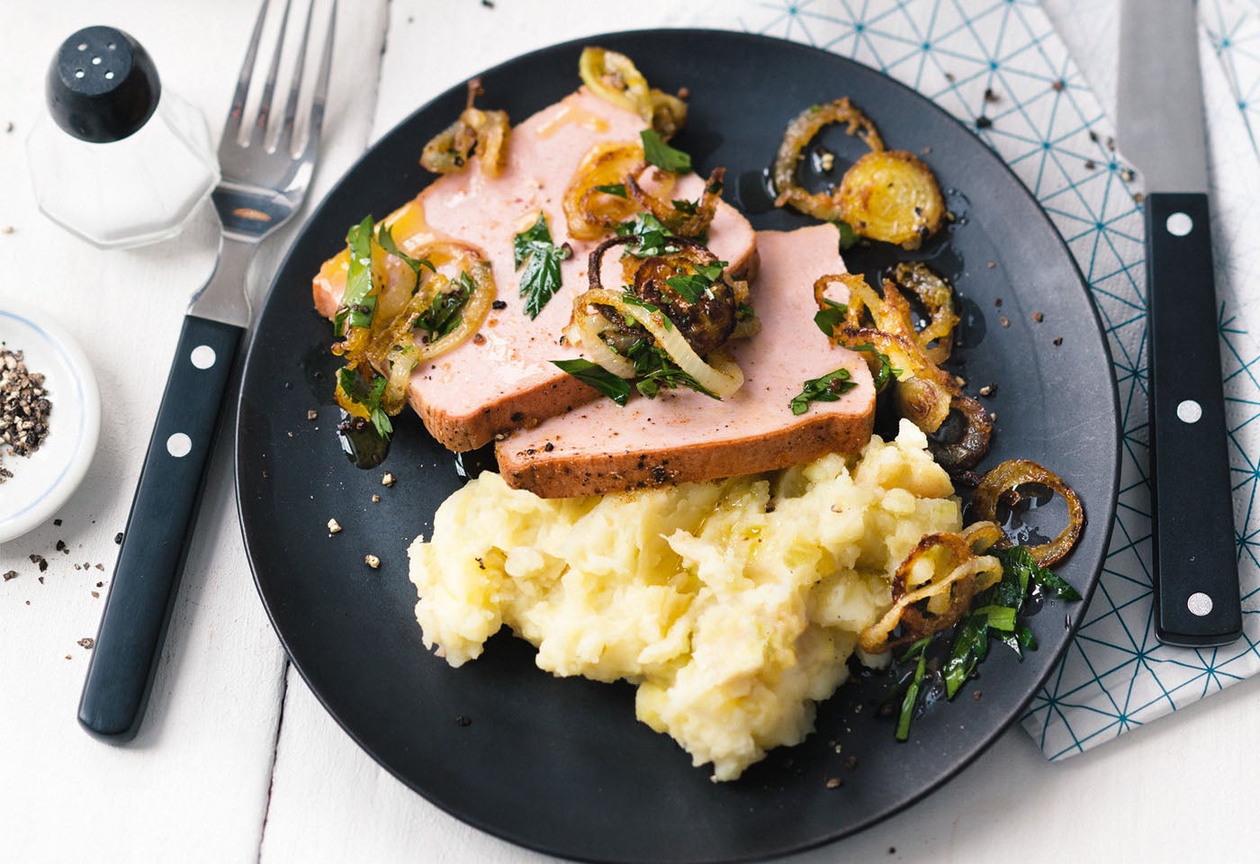 Backofenleberkäse mit Apfel-Erdäpfelpüree und Zwiebeln