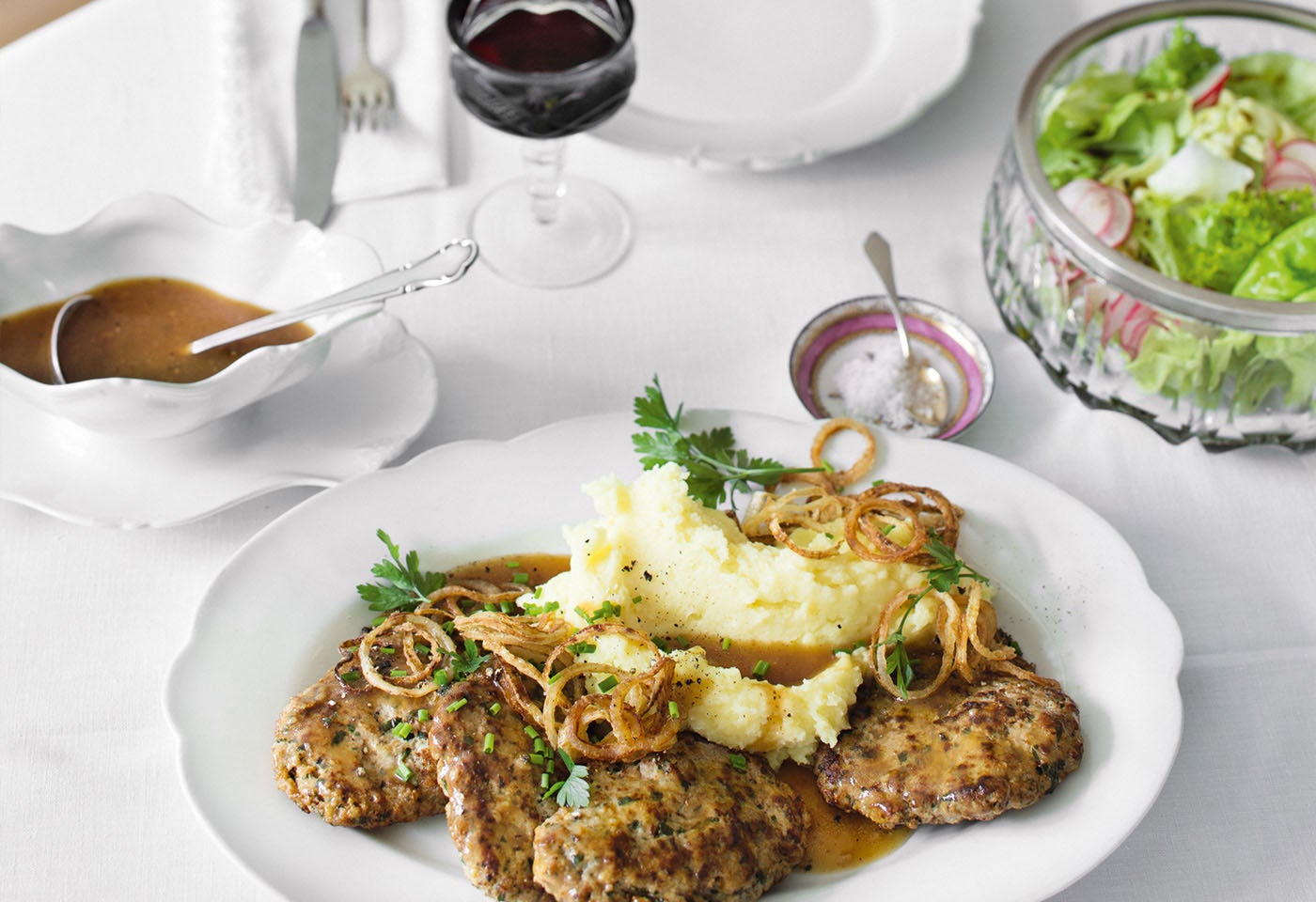 Butterschnitzel mit Püree, Röstzwiebeln & Salat